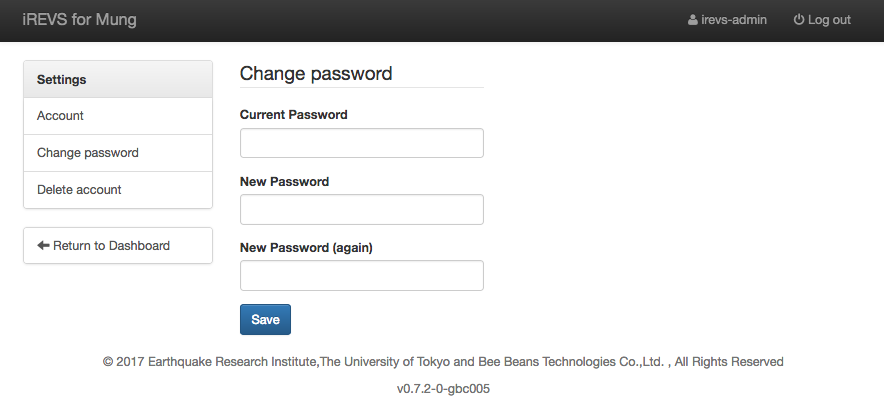 To change the password, Enter "Current Password", "New Password" and "New Password (again)", then click [Save] button.