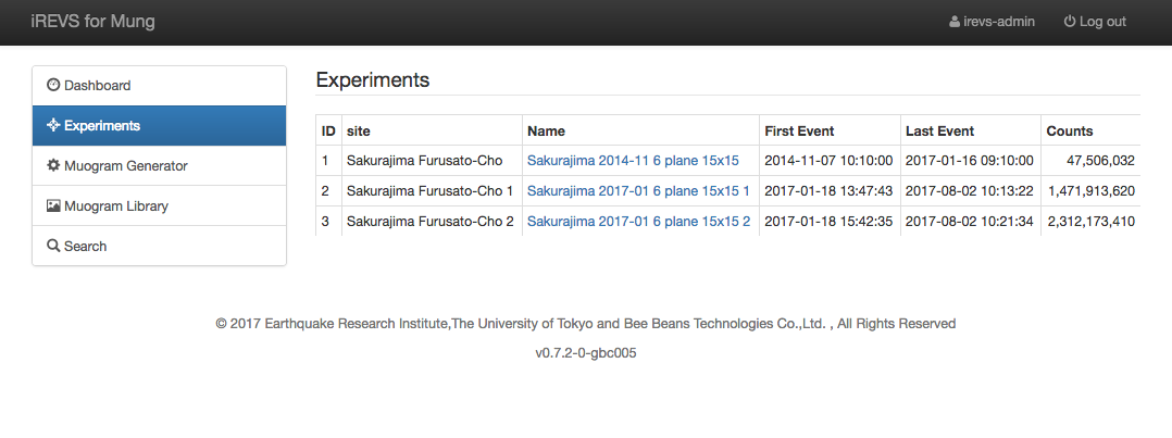 Click each link of experiment to display Experiments details page and you can refer the statistics and daily Muogram.