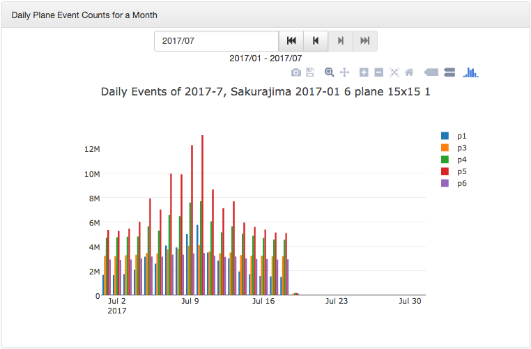 Daily plane event counts for a month displays the number of events in each month's corresponding experiment with a bar graph by plane.