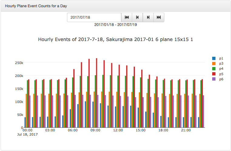 Hourly plane event counts for a day displays the number of events par day for the corresponding experiment with a bar graph by plane.