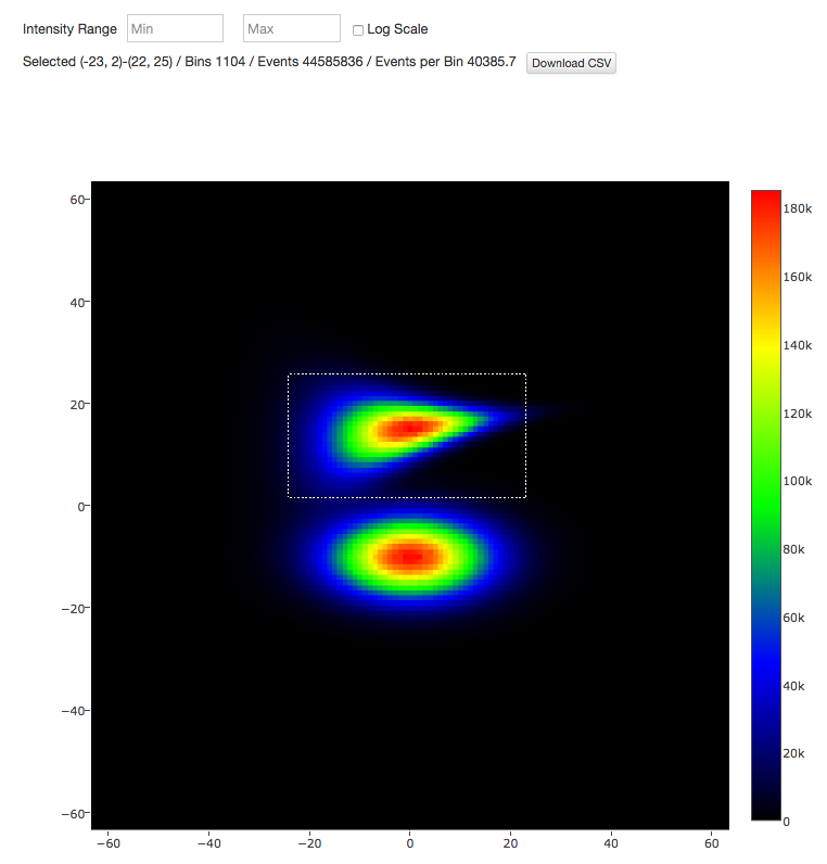 From the left, the bin information shows the coordinates of the selection range, the number of bins, the total number of events in the bin range, and the average number of events (per bin).