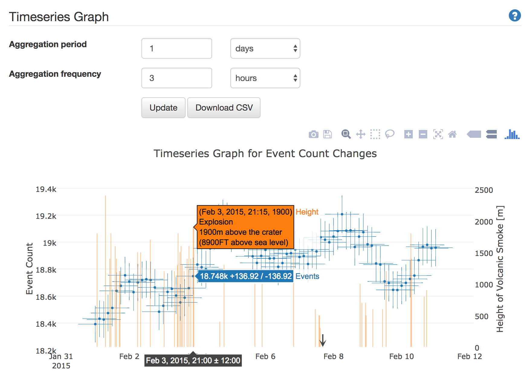 Click Update button to displaye the time series change graph (blue plot) of event number, and the graph (orange bar graph) of the volcanic smoke height when the eruption occurs.